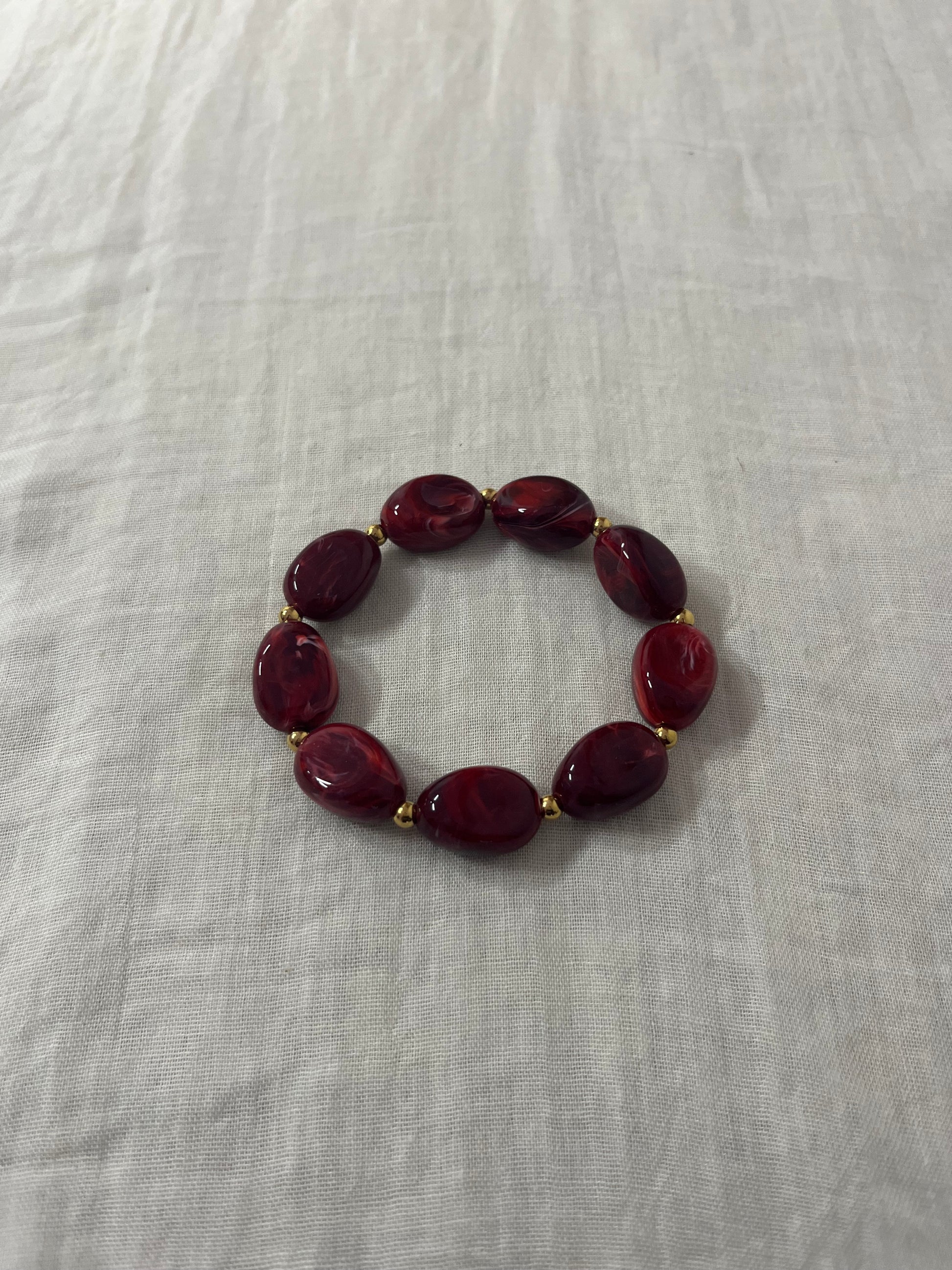 - Ce bracelet est composé de perles irrégulières reliées par des perles dorées sur son fil élastique.