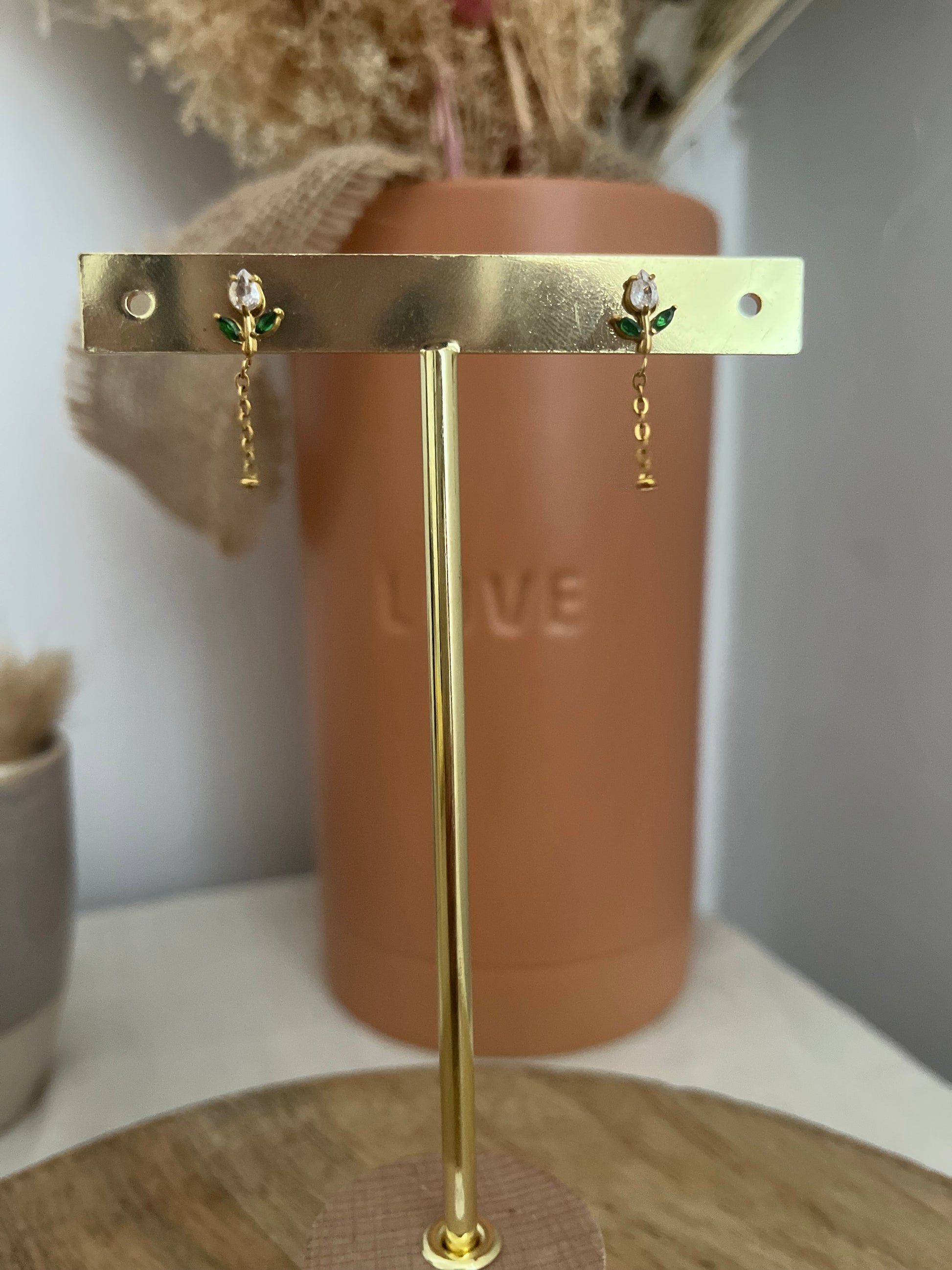 - Clous d'oreilles fleur avec une pierre de crystal blanc + petite chainette